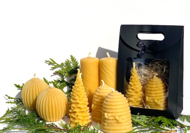 Produced from the pure beeswax in our hives, these natural candles have no paraffin or additives and a sweet, natural scent. Unlike many commercially produced wax products, these are ecologically friendly and will not emit paraffin fumes—a range of 4 candle styles. Individually hand-cast with love, they make an ideal finishing touch to the Christmas table!