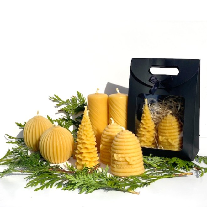 Produced from the pure beeswax in our hives, these natural candles have no paraffin or additives and a sweet, natural scent. Unlike many commercially produced wax products, these are ecologically friendly and will not emit paraffin fumes—a range of 4 candle styles. Individually hand-cast with love, they make an ideal finishing touch to the Christmas table!